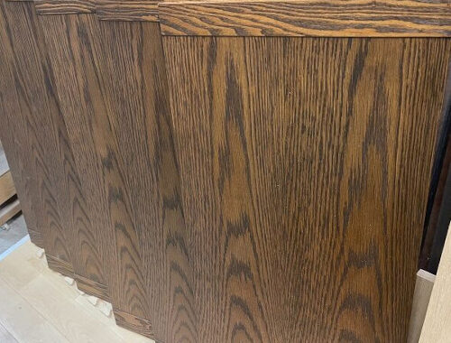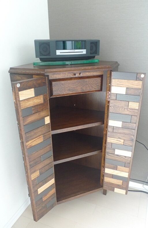 キャビネットの扉は、裏表老面ともブロック型に成形したナラ材を複数パタンで着色し、1つ1つ組み上げました。