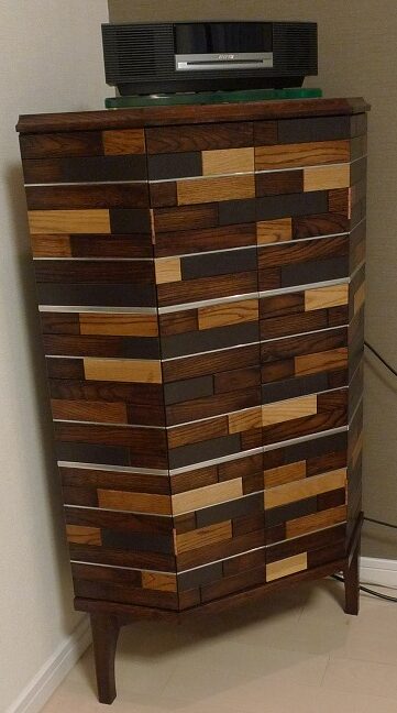 キャビネットの扉は、ブロック型に成形したナラ材を複数パタンで着色し、1つ1つ組み上げました。