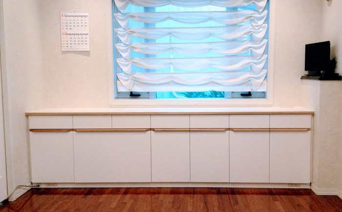 今回は圧迫感の出ない白のポリ合板を使用致しました。