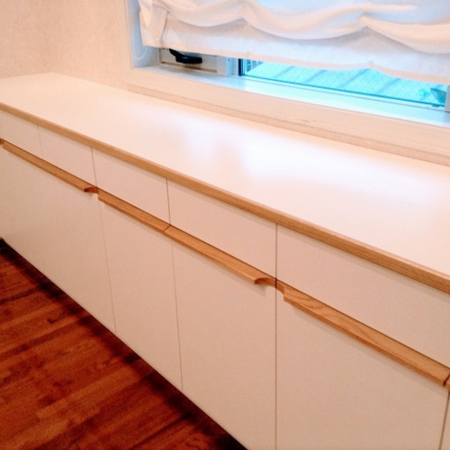 天板の前と扉の手掛けの部分にはアクセントとして、ナラ材(無垢)を使用致しました。