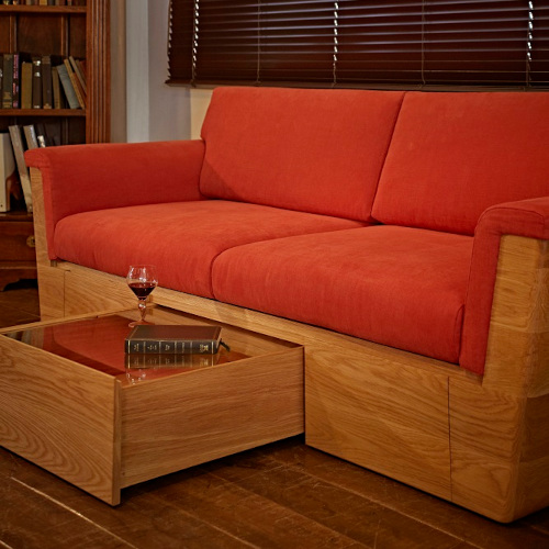 張地はお客様のご要望により自然素材100%の麻・綿を使用いたしました。 中央の引き出しは、テーブルに。天板にはガラスを使用しているので、引き出し内部はコレクションケースとして使えます。