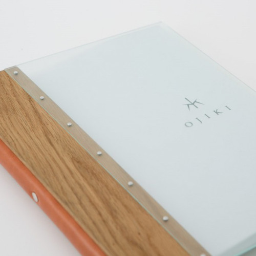 ガラス色半透明のアクリル板を使用し、表紙のロゴや写真などが見えるようになっています。
