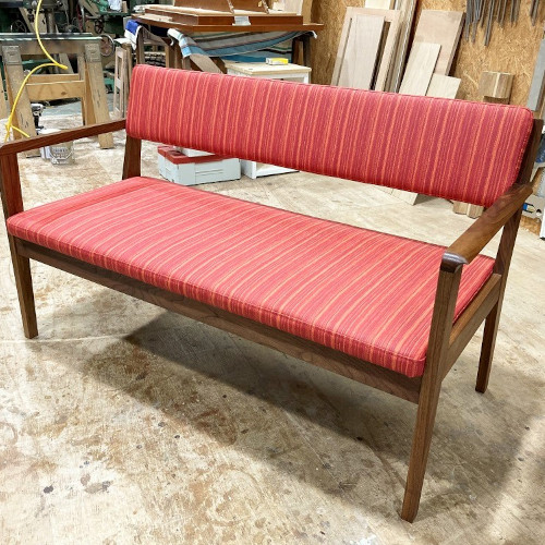 ウォールナットにソファ生地の赤色が良く映えた2人掛けベンチです。