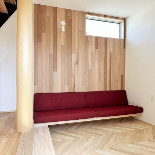 壁面の板や丸太の柱、ヘリンボーン張りのフローリングなど木に囲まれた空間の中で、ソファのエンジ色がほどよいアクセントに。
