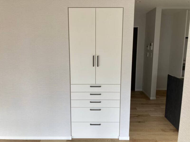 オーダーメイドだからこそできる、壁の寸法にぴったり収めることができる収納家具です。