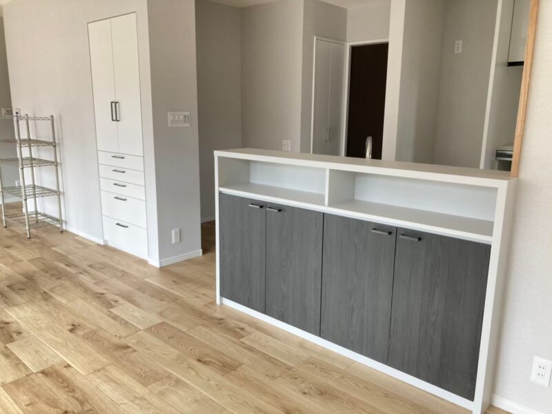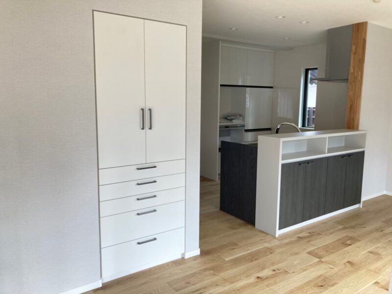 リビングとキッチンの間に配置することで、収納と間仕切りの役割も兼ねた家具となっています。