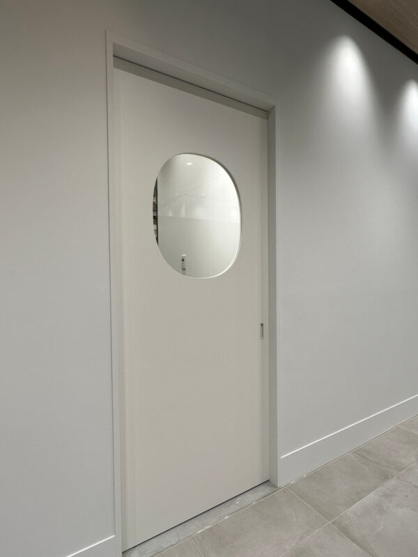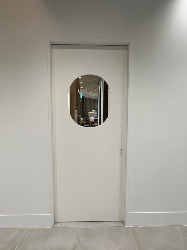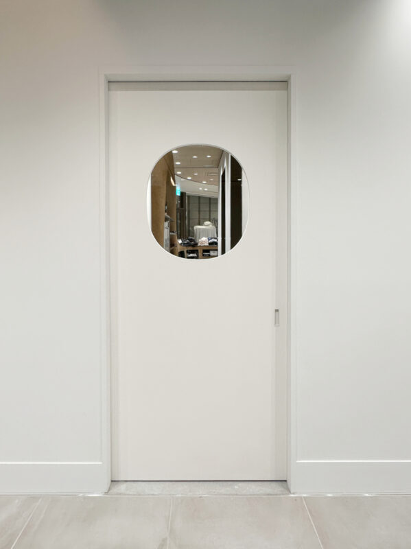 パン屋さんの従業員さんが出入りする引き戸ドアを、ソフトクローズ対応の金物を使用し製作いたしました。