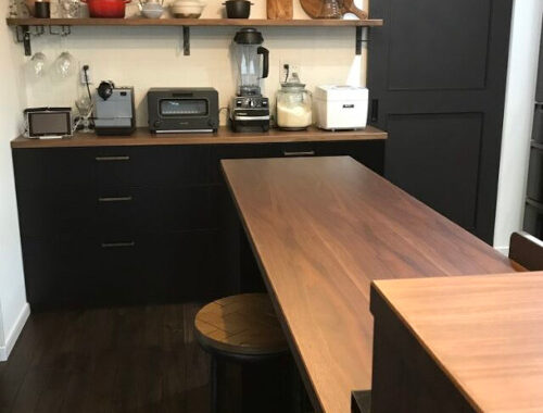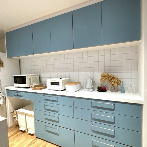 食器棚の扉は、既製品からファニチャーリノリウムの扉に一式交換いたしました。