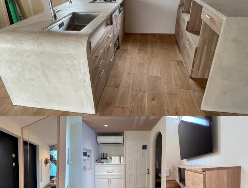 対面キッチンカウンターの収納棚は建築材でも使用されるフレキシブルボード(セメントと繊維が原料)を使用。