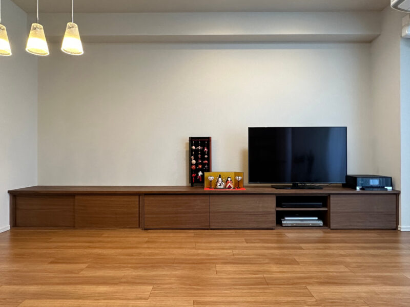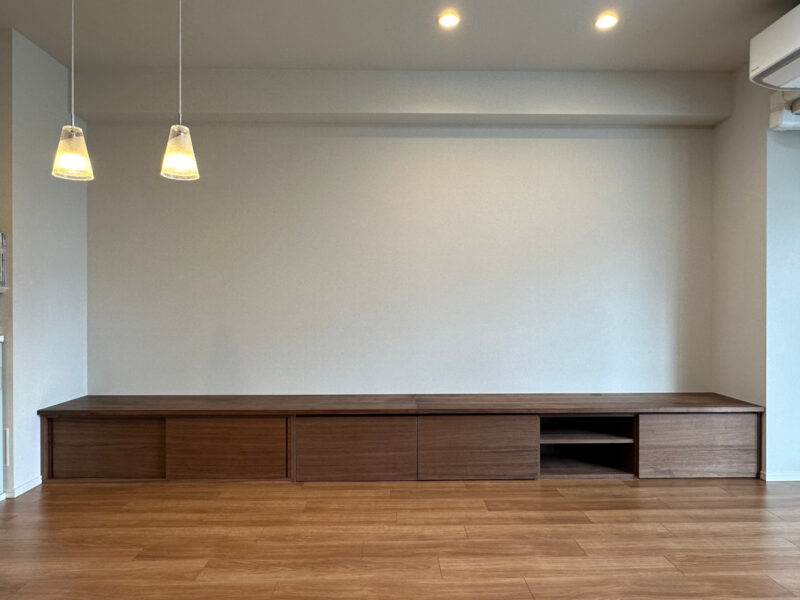 壁面いっぱいにつながる、なが〜いロングTVローボードのオーダーメイドについてご紹介いたします。