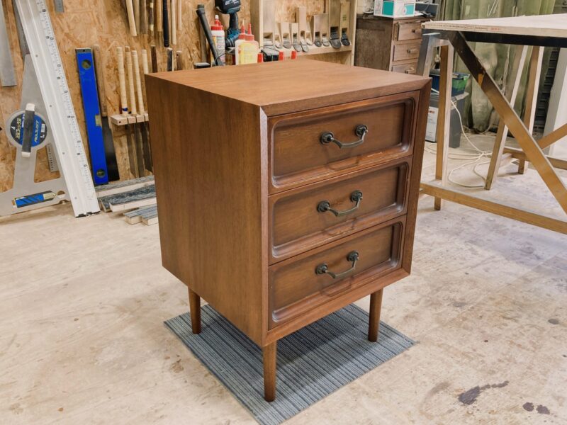 そこでOJIKI工房では、元のタンスの引き出し部分を再利用しつつ、本体ボックスと脚部を新たに製作。