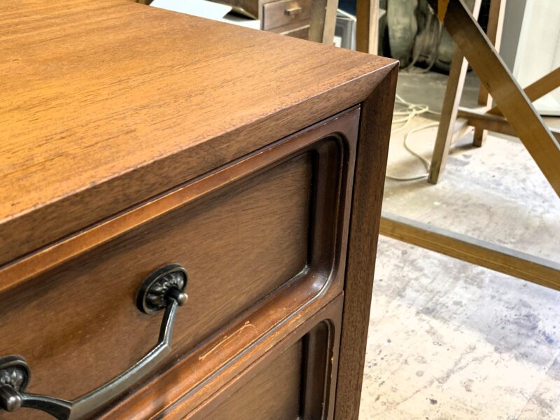 長年の使用による表面の傷みが見られ、天板には擦れや色むらもありました。