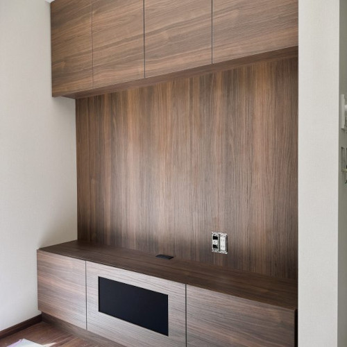 壁寸法に合わせた造り付けサイズでの製作で、壁との一体感と無駄のない収納スペースが実現しました。