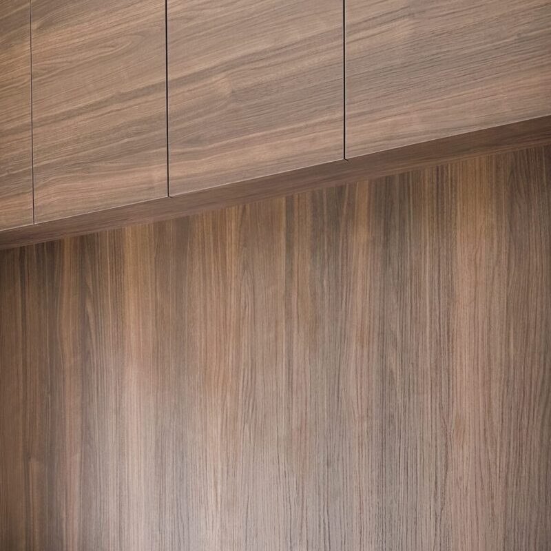 • 一体感のある背面パネル:天井まで続く同柄の背面化粧板が、空間に高級感と統一感をもたらします。