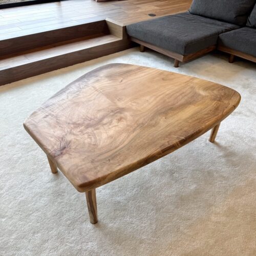 天板は、クスの一枚板を丁寧に加工したもの。丸みを帯びたエッジと、やや三角形に近いユニークな形状が、リビングに個性を加えながらも主張しすぎない絶妙なバランスです。