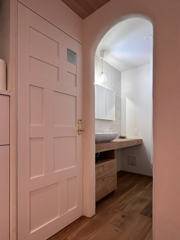 洗面台は陶器ボウルとナラ材のバランスが美しく、空間全体がやわらかな印象に。