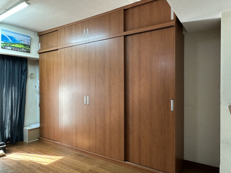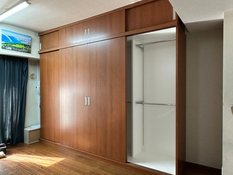収納不足を解消したいというお客様のご要望に応じて、壁面いっぱい・天井いっぱいに設置できる大型収納家具を製作・施工しました。お部屋の梁やコンセント位置など既存環境に合わせた完全オーダーメイドです。