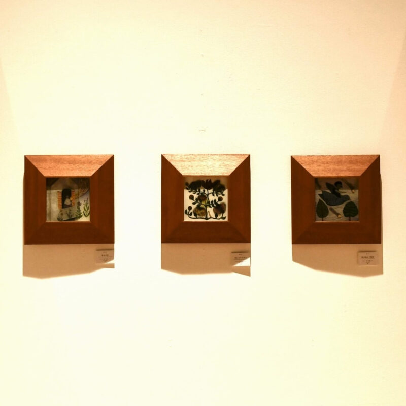 展示風景をご覧いただくと、作品一つひとつが額縁に包まれることで、より物語性と立体感が際立っているのがわかります。温かみのあるマホガニーとやさしい照明が相まって、空間全体に静かな美しさをもたらしています。